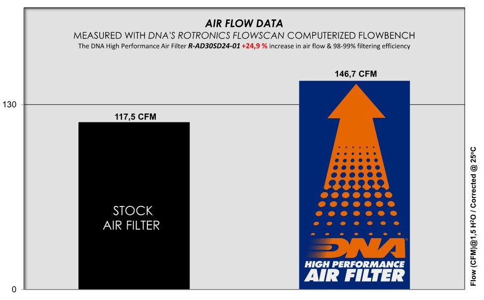 DNA High Performance Air filters help provide optimal flow and maximum engine performance and fuel efficiency through a world-class filtration design that removes 98% of air contaminants. Each filter is designed and manufactured to meet or exceed all original equipment operating specifications.
