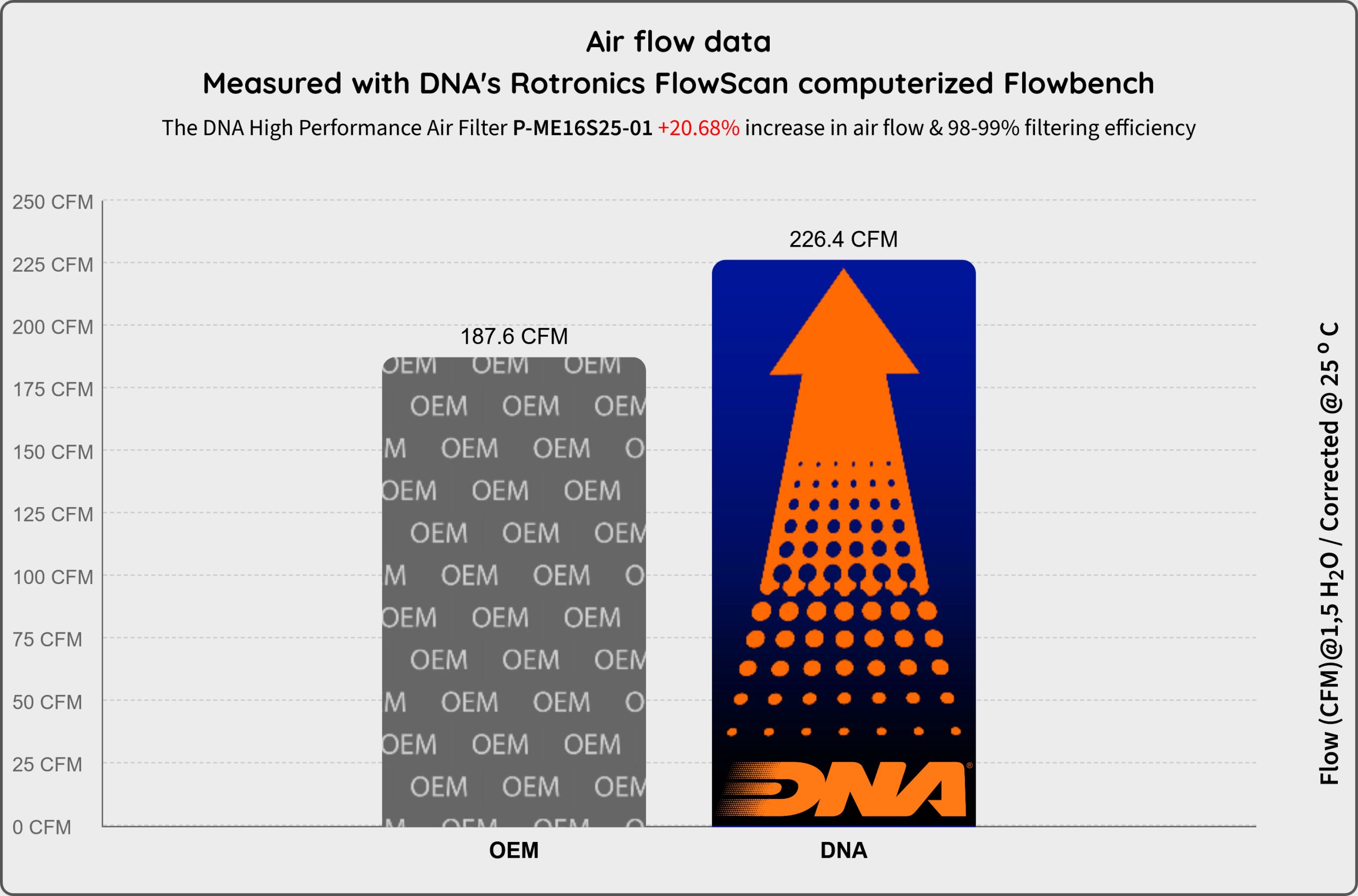 DNA High Performance Air filters help provide optimal flow and maximum engine performance and fuel efficiency through a world-class filtration design that removes 98% of air contaminants. Each filter is designed and manufactured to meet or exceed all original equipment operating specifications.